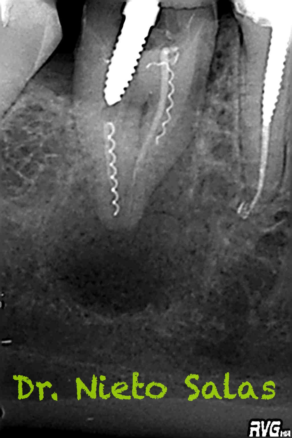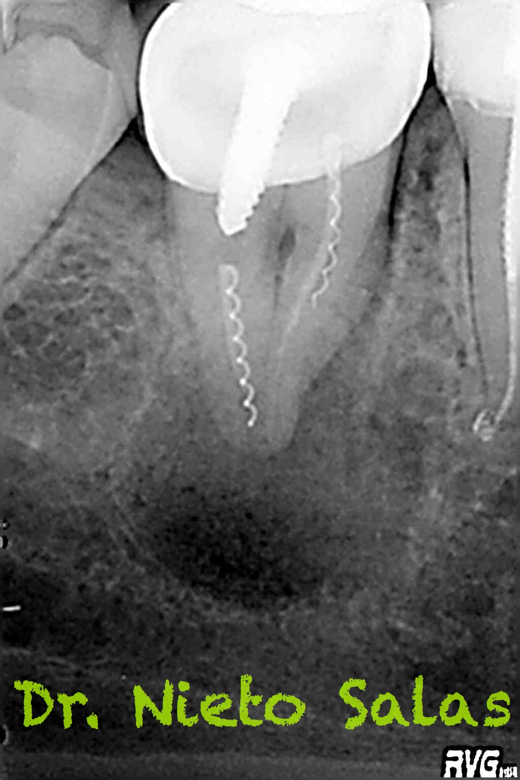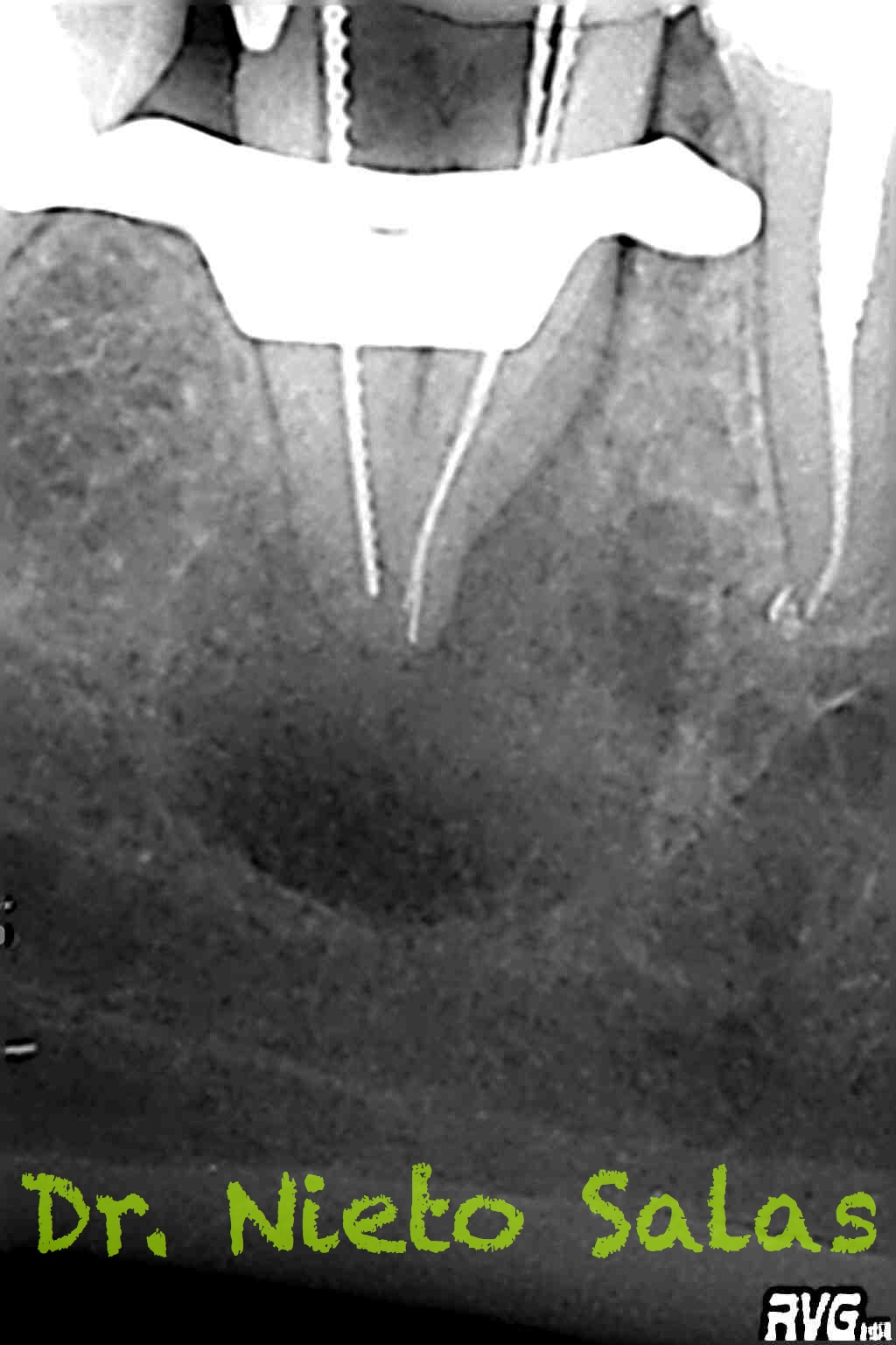 Nos remiten a la clínica a una paciente con un tratamiento previo de endodóncia realizado ya hace unos 5 años y que presenta una agudización del proceso. Se trata de un fracaso endodoncico por una falta de sellado tanto coronal como apical, en el que en el espacio intra-conductos nos encontramos dos léntulos, y en el acceso a los mismos un perno prefabricado.
