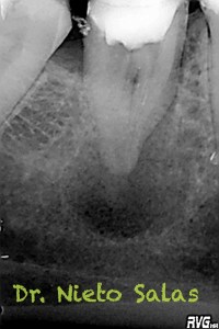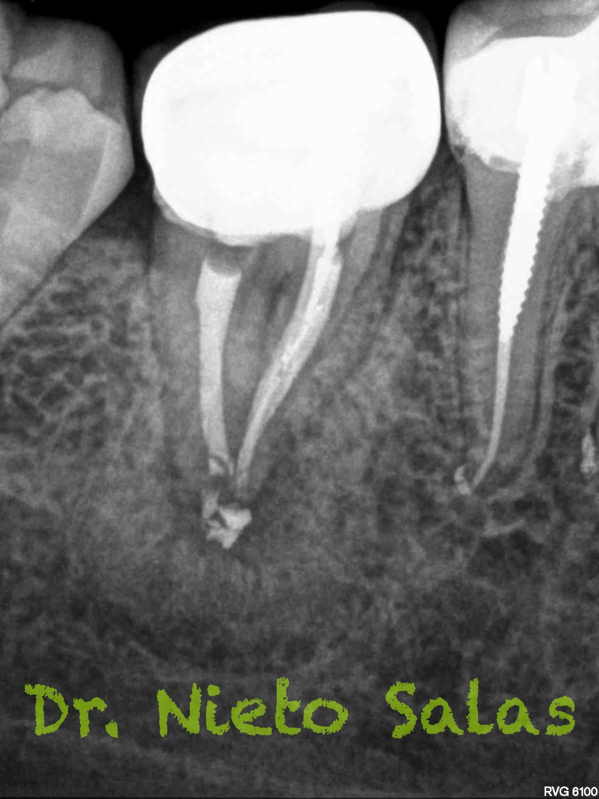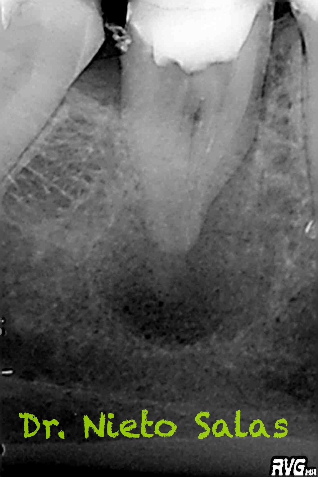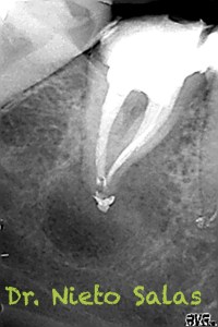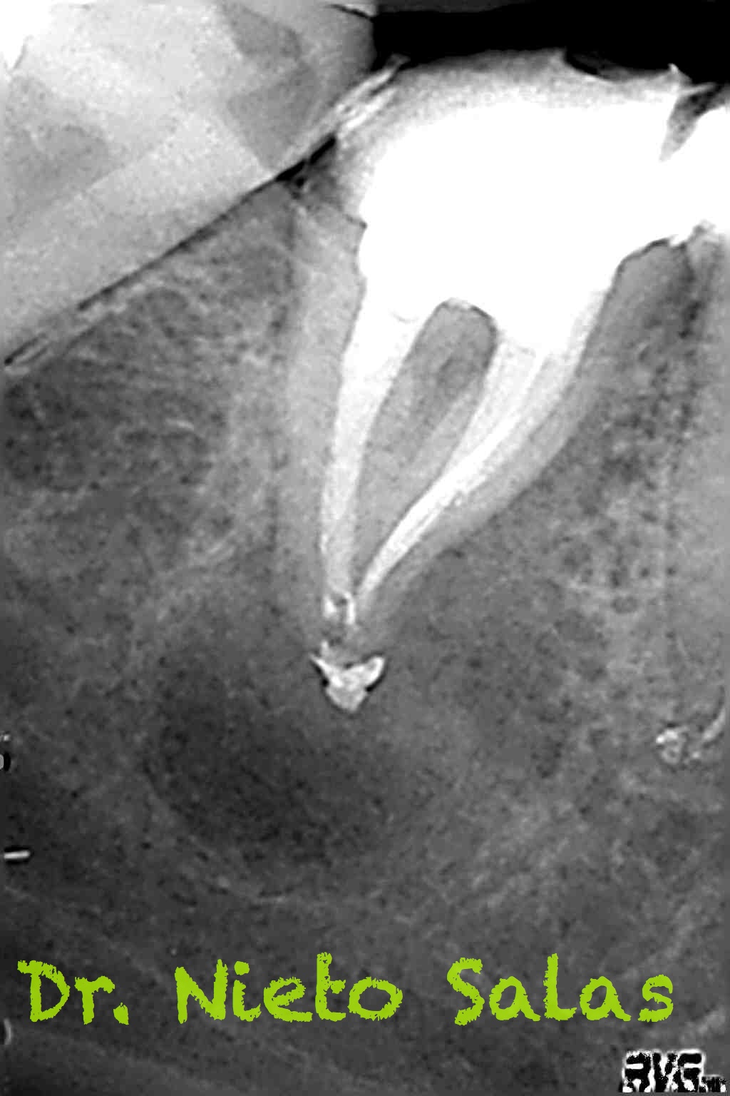 Nos remiten a la clínica a una paciente con un tratamiento previo de endodóncia realizado ya hace unos 5 años y que presenta una agudización del proceso. Se trata de un fracaso endodoncico por una falta de sellado tanto coronal como apical, en el que en el espacio intra-conductos nos encontramos dos léntulos, y en el acceso a los mismos un perno prefabricado.