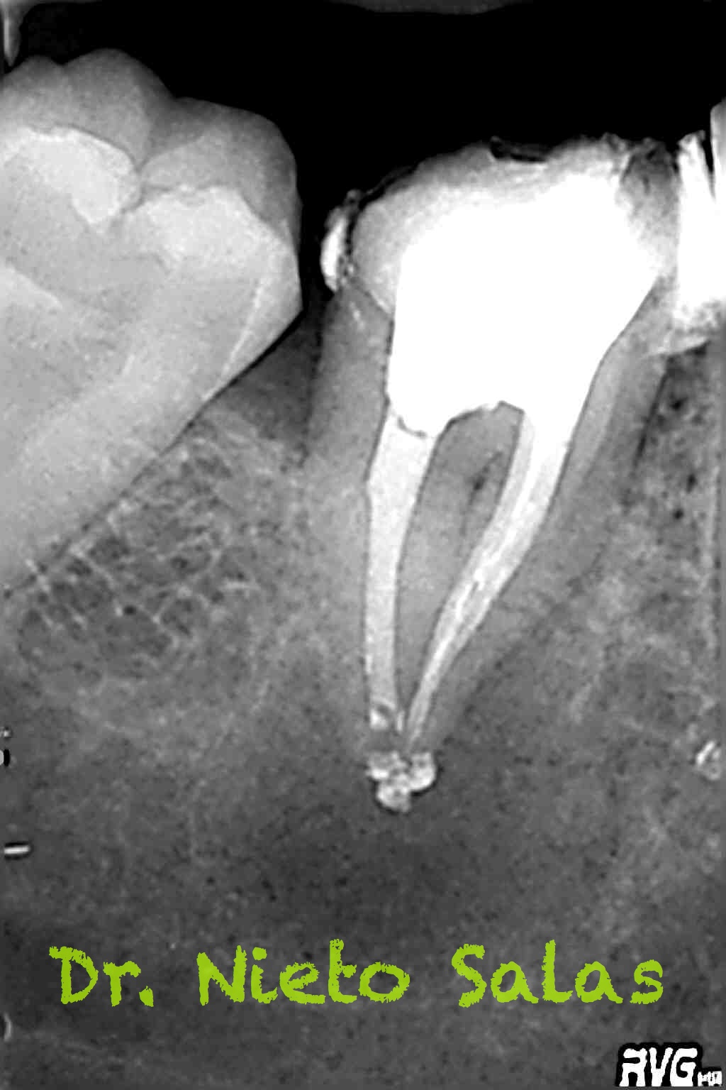 Una vez que tenemos todo preparado, se trata de un tratamiento de endodoncia convencional, con lo que seguiremos los pasos de limpieza, conformación y sellado del sistema de conductos.