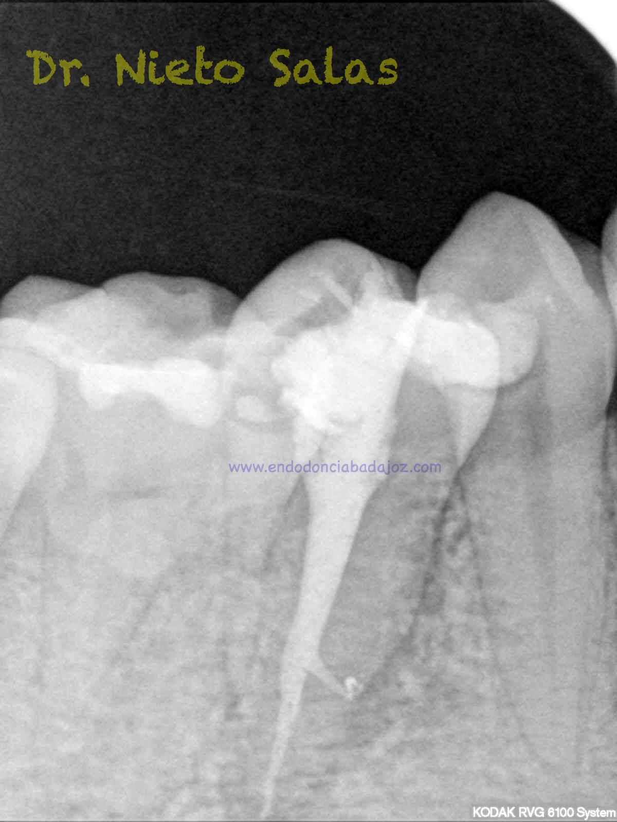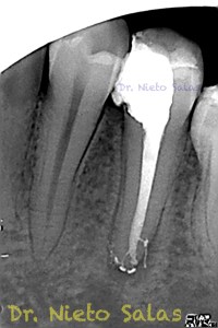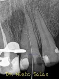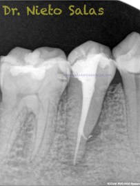 Nos llega a la clínica  este 4.5 con necrosis y periodontitis apical. la instrumentación se realizó con técnica de crown-down con limas K3 (SybronEndo) y la obturación con la técnica de ola continua de Buchanan, el tiempo de trabajo (para mi bastante importante) sobre 70-90 min.
