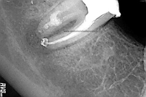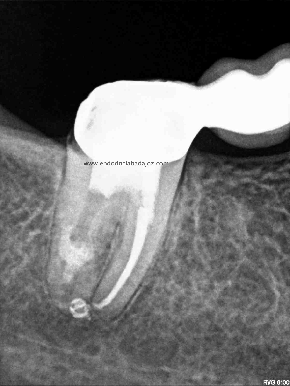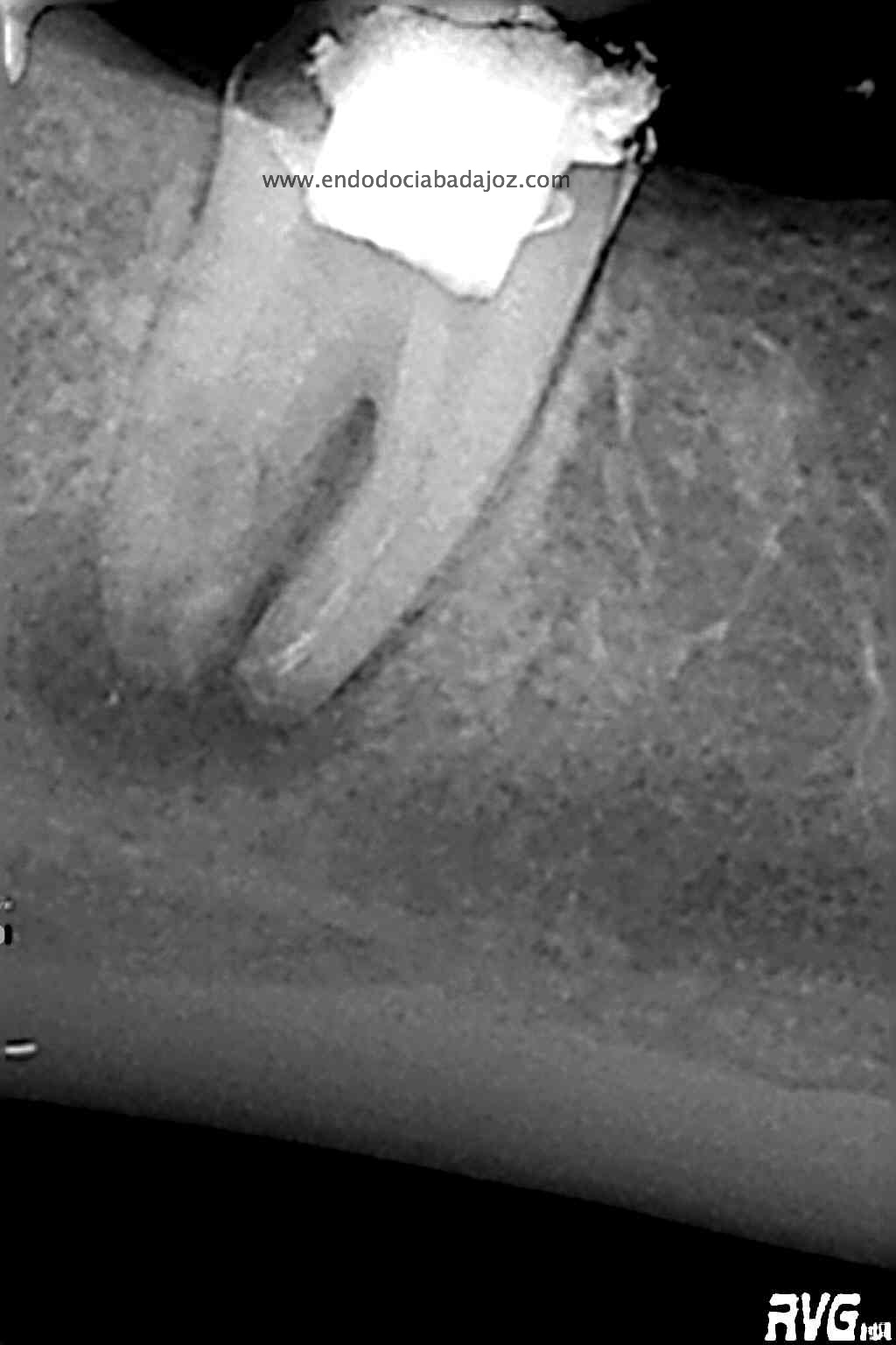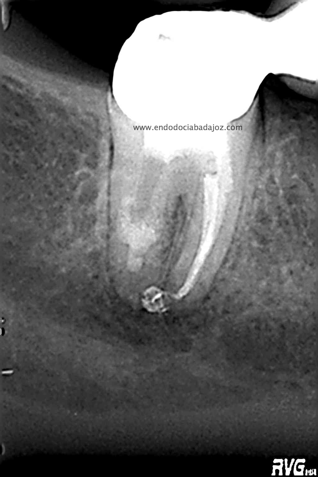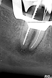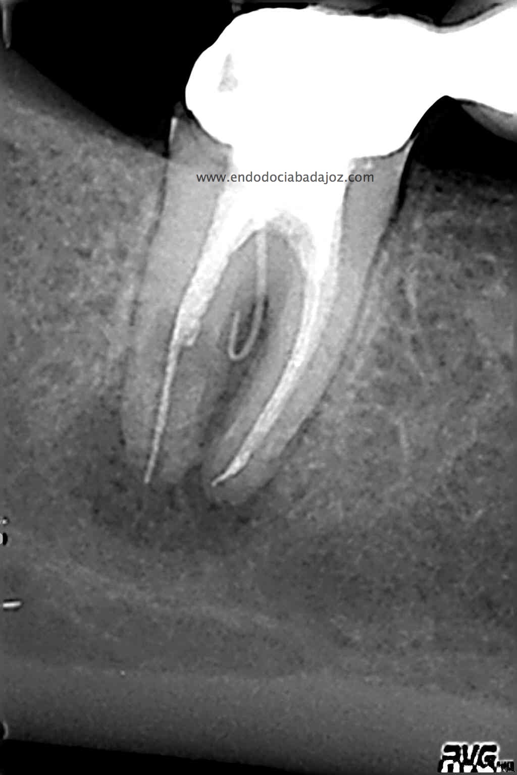 Este caso lo resolveríamos en varias sesiones, después del manejo de los conductos mesiales, con una preparación biomecánica terminando en una conicidad del 6% y un diámetro apical de 30 en conductos mesiales.