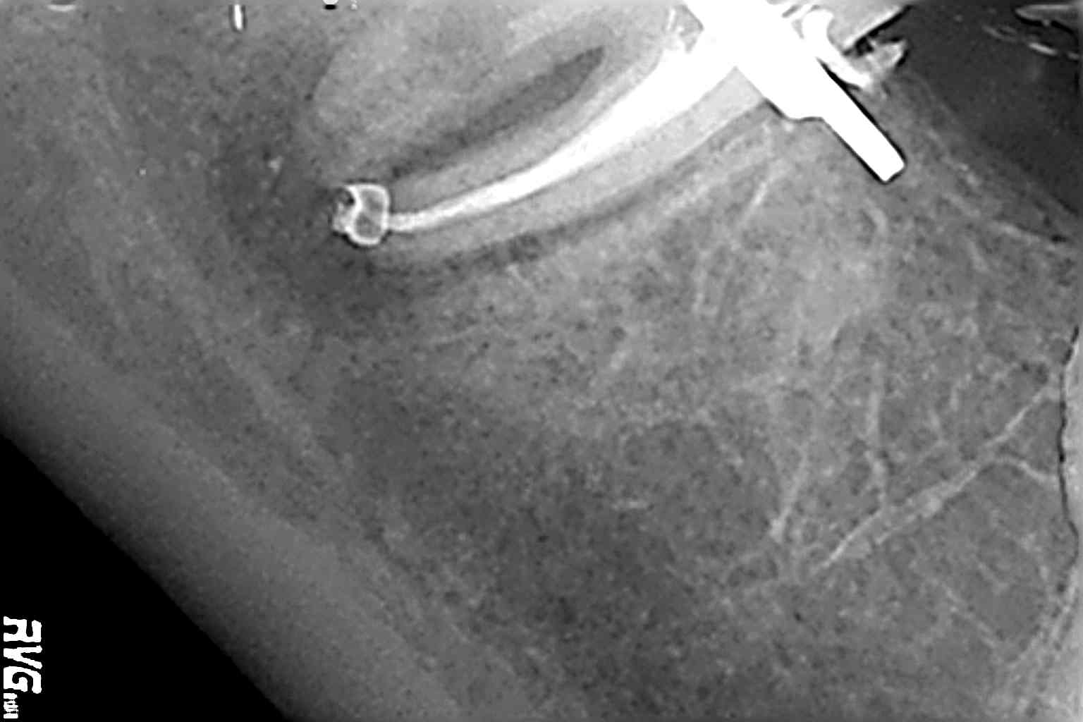 Con ayuda del microscopio, pudimos confirmar que se trataba de una reabsorción interna en el tercio medio y una reabsorción radicular del conducto distal.