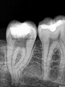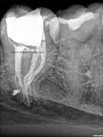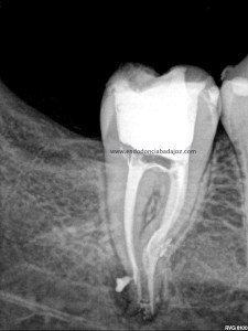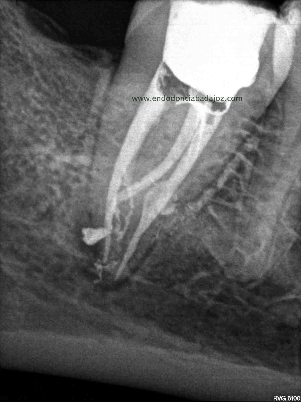 La anatomía de los conductos nos hacia sospechar de un caso algo más complicado. Lo más complicado fue mantener la permeabilidad de los conductos. Instrumentamos con sistema rotatorio de Mtwo, mucha irrigación, se usó Irrisafe en los últimos lavajes, y como sistema de obturación usamos Condensación vertical con ola contínua, haciendo un backfilling con la Pistola Obtura II.