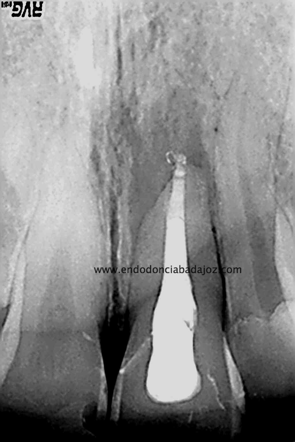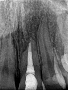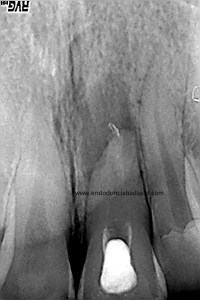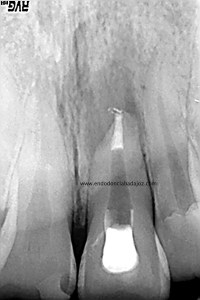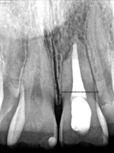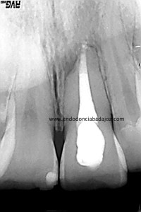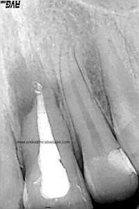 Lo realizamos en dos sesiones, algo discutido entre compañeros, pero que en este caso, no dudo en absoluto,  pues presentaba una reabsorción apical. Incluso, a la hora de colocar el H de Ca, la medicación intraconducto elegida, decidimos extruirla.
