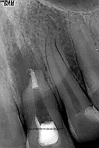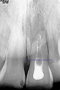 Intentamos eliminar toda la pasta de las paredes, determinamos el diámetro apical superior a 80, con lo que decidimos actuar colocando una barrera de M.T.A. (Trióxido Mineral Agregado) y hacer un backfilling con gutapercha inyectada.