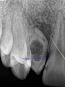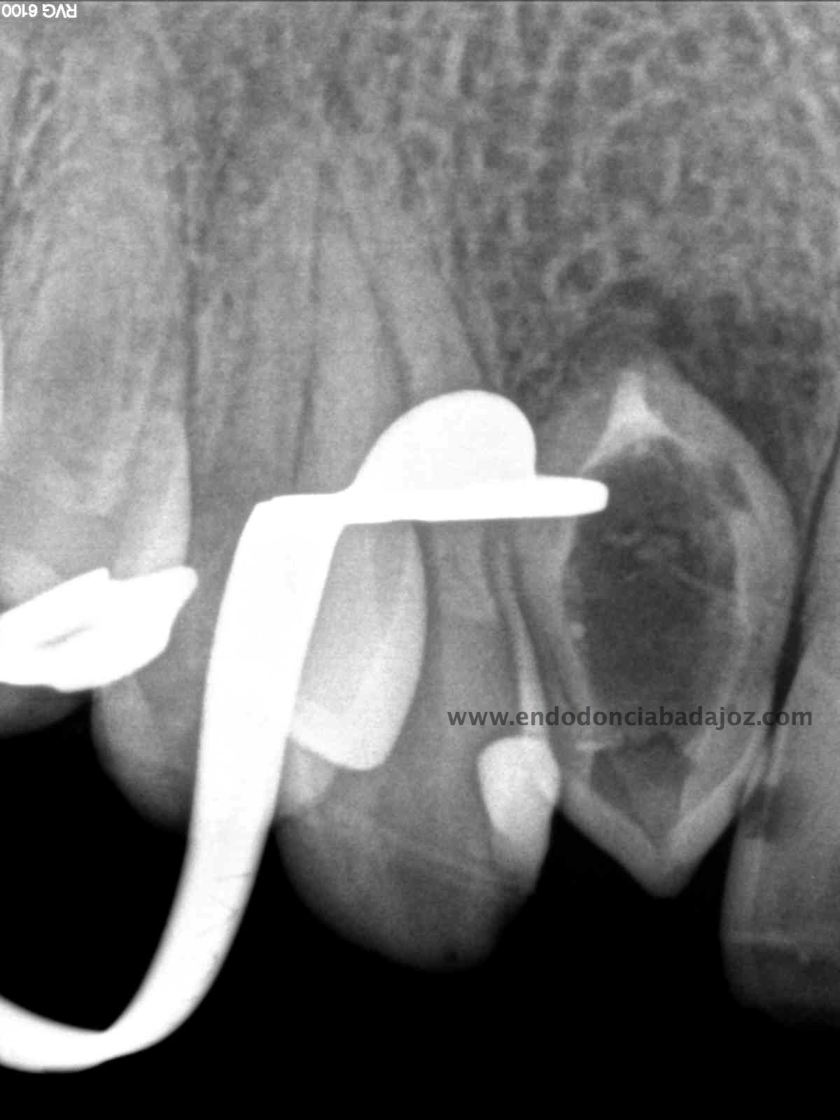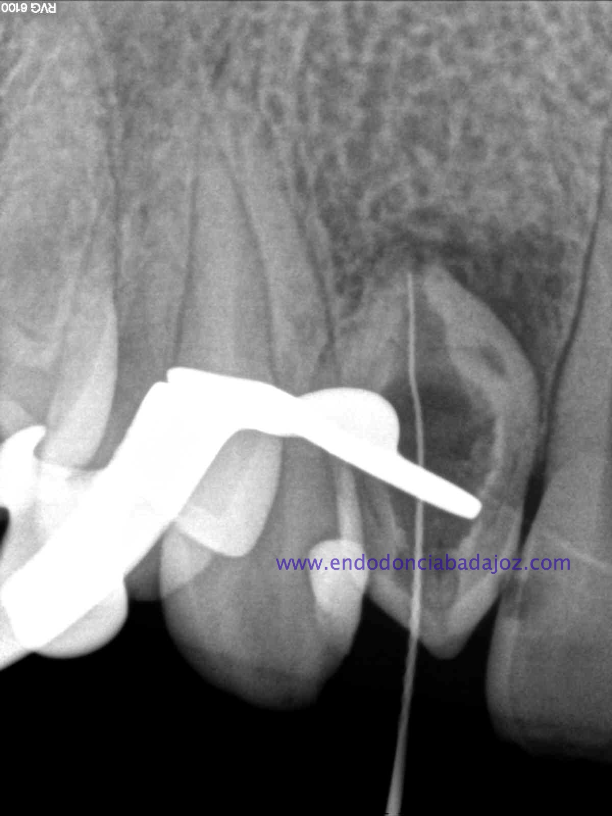 Nuestro caso, se trataba de esta pieza con necrosis pulpar con afectación periapical que presentaba una vía de drenaje (fístula). Esta radiografía muestra el camino de la fístula a la lesión apical.