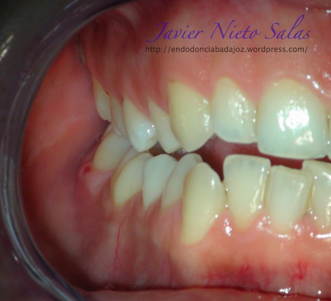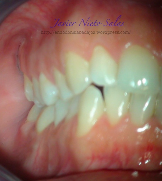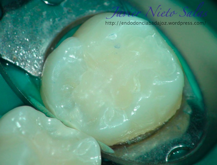 Sin aparente linea de fisura coronal, no vemos, con la ayuda de la magnificación, linea de fisura, lo que no nos descarta definitivamente que se trate de este síndrome de fisura, pues como ya sabemos pueden aparecer en diferentes tramos de la pieza, clasificando así los diferentes tipos.