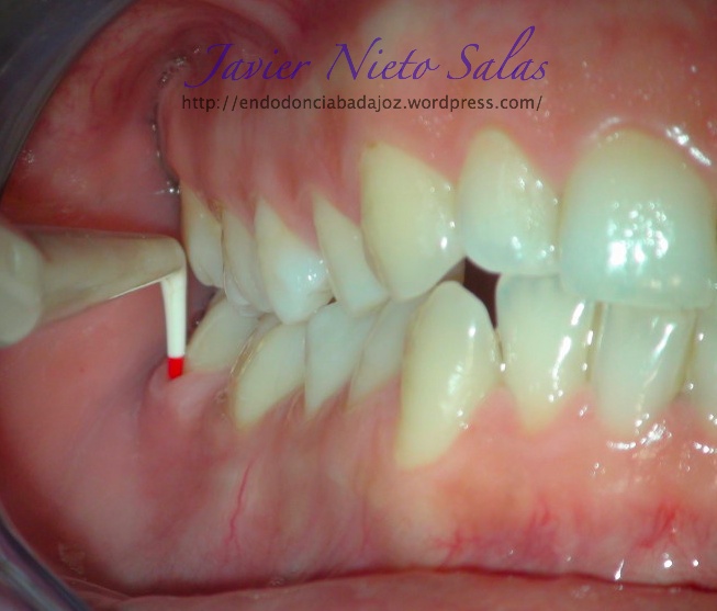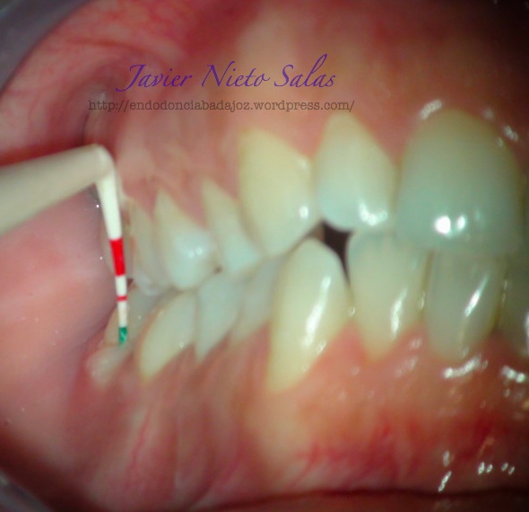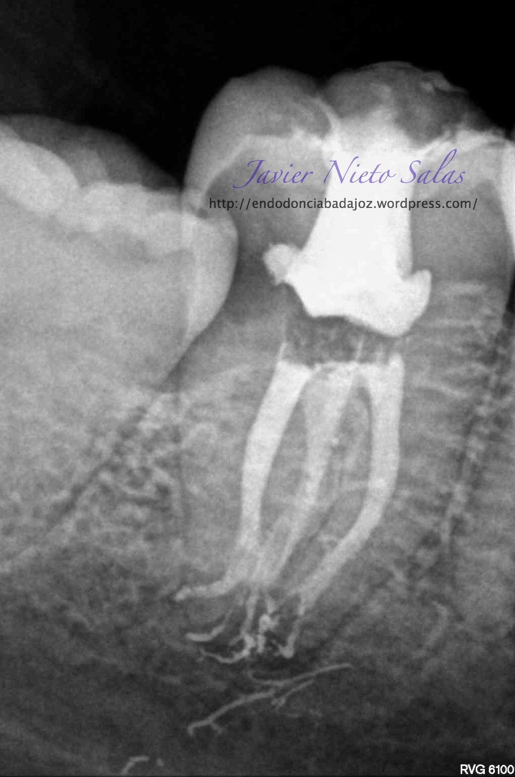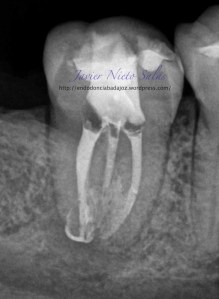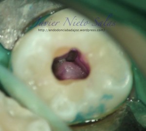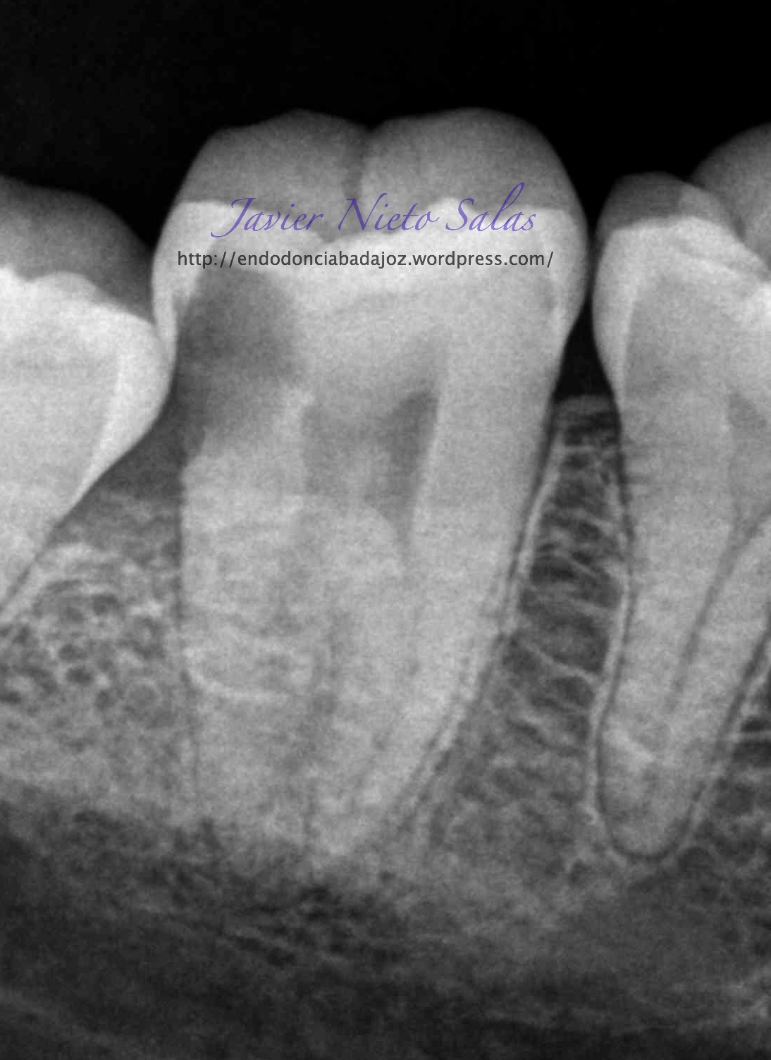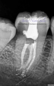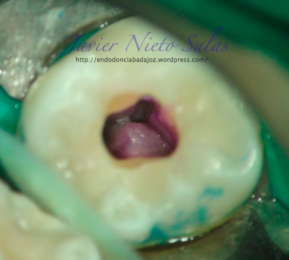 Realizamos el tratatamiento de conductos con la sospecha del causante de la necrosis es una fractura vertical, pero no hemos podido ver la linea de fisura.