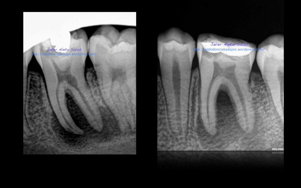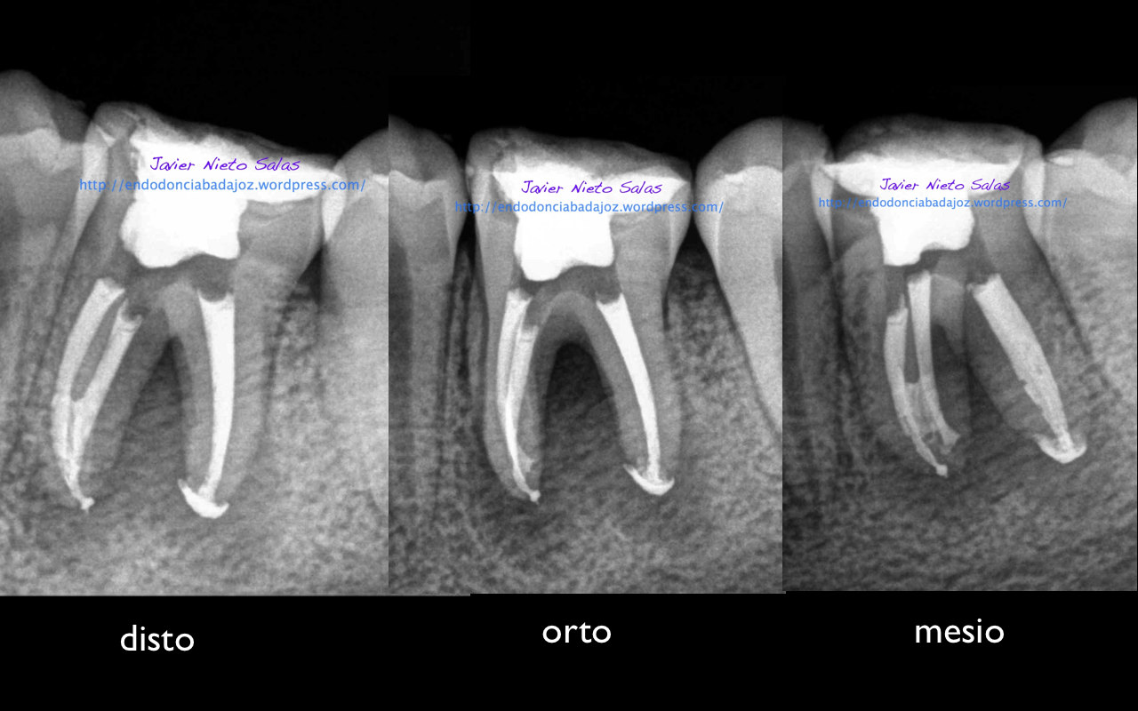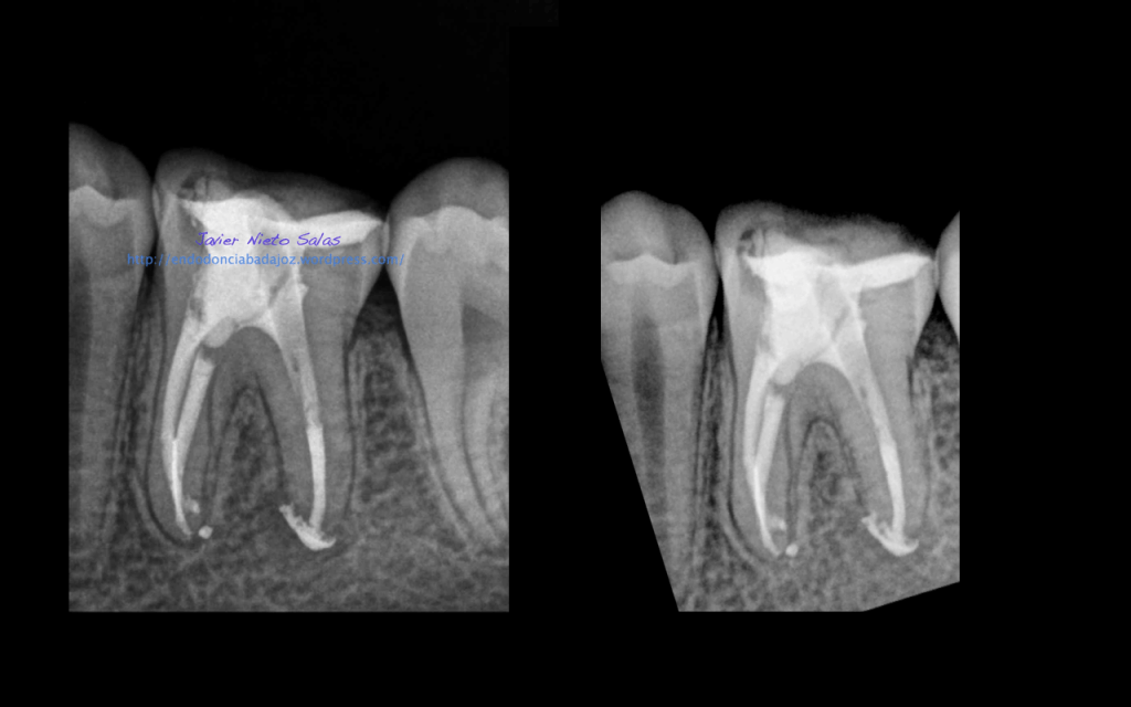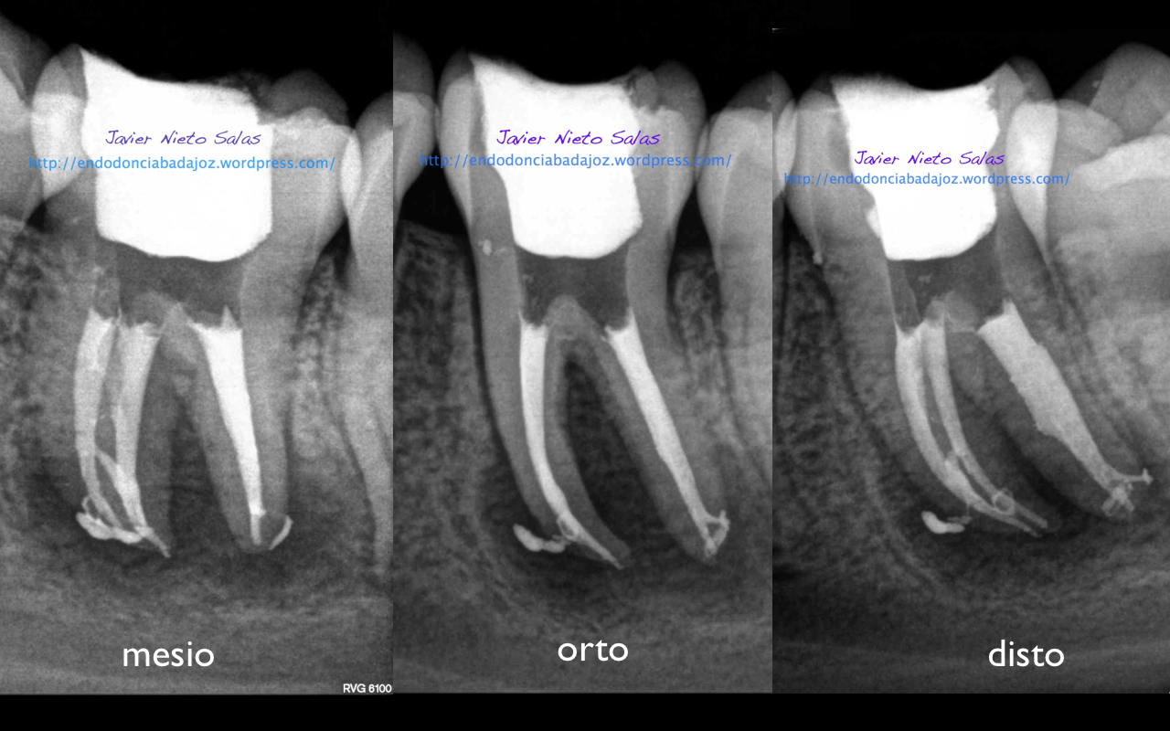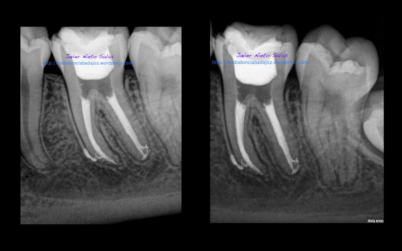 Con respecto a tu pregunta sobre las dos últimas Rx, que son la revisión de las anteriores, de una periodontitis apical crónica de un 4.6, si puedes observar en la radiografía distalizada final, existe un istmo entre ambos conductos, y puede ser que exista un conducto lateral, pero como ya sabemos, existe una gran complejidad anatómica del sistema de conductos. El blog de Ronal Ordinola, es fantástico, y puedes ver esas anatomías en las que piensas en que la endodoncia es un verdadero RETO.
