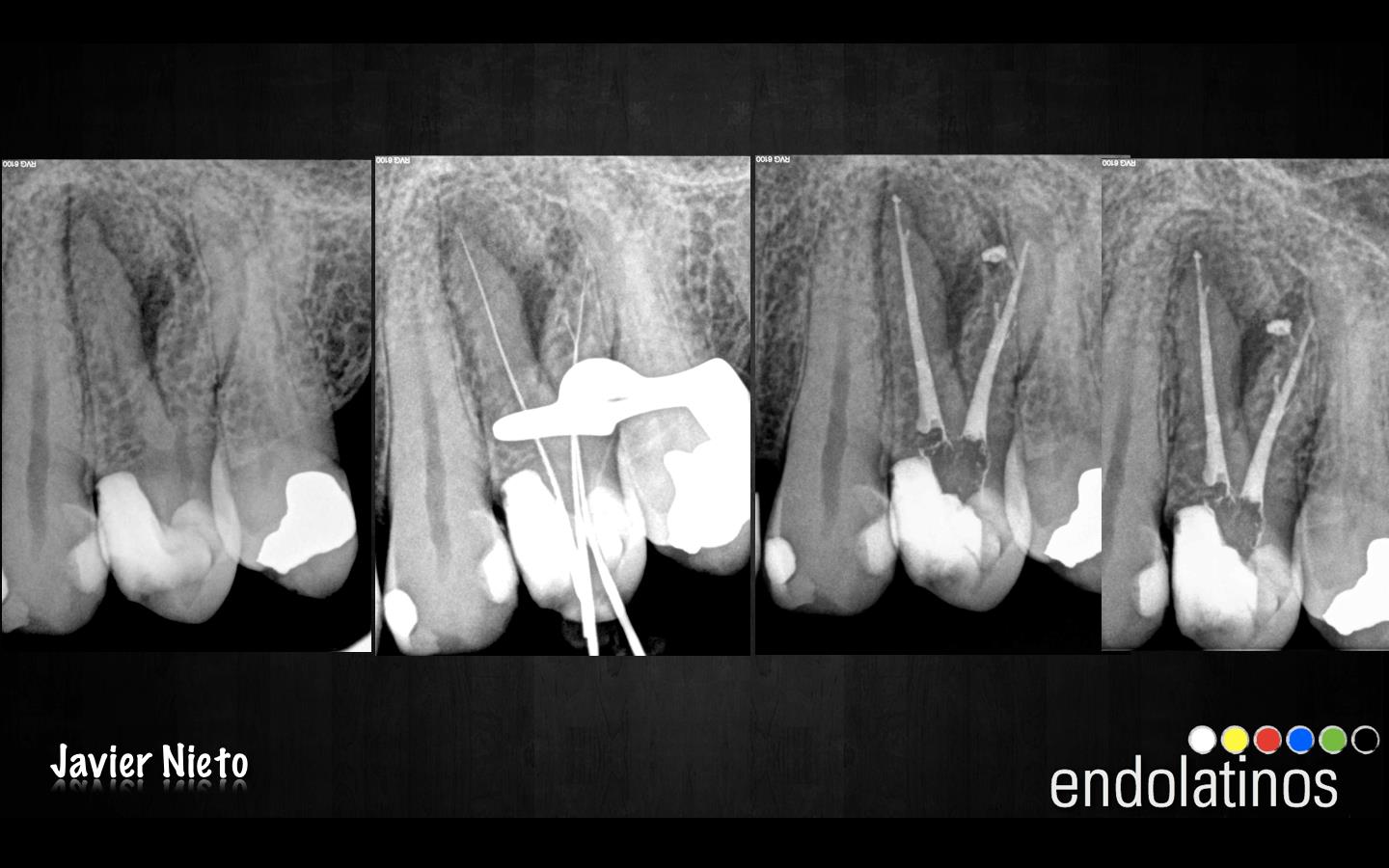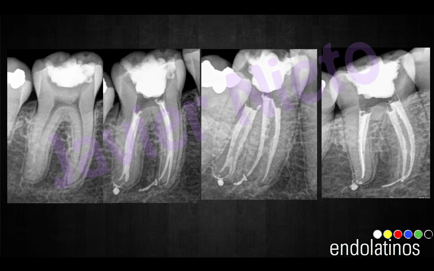 Se trata de un paciente joven, 25 años de edad,  diagnosticado con una pulpitis irreversible, se instrumentaron los conductos con el sistema de limas rotatorias de Ni-Ti , Mtwo, hasta un 25-6%.  Procuramos hacer hincapié en la fase de irrigación, ya que conformamos el conducto bastante rápido, por tratarse de sistemas de conductos amplios, y sospechabamos de itsmos mesiales en su anatomía, con lo que debíamos eliminar el tejido pulpar. Usamos hipoclorito al 5% activandolo después de haber irrigado con EDTA para eliminar la capa de barrillo dentinario. Se activó con las Irrisafe, y después dejamos actuar al hipoclorito durante dos fases de 3 minutos. Se obturó con condensación vertical con la técnica de Ola continua de Buchanan  algo modificada, creando más masa de gutapercha en la parte del tercio medio y apical. Un backfilling con una técnica de gutapercha inyectada con la pistola Obtura III.