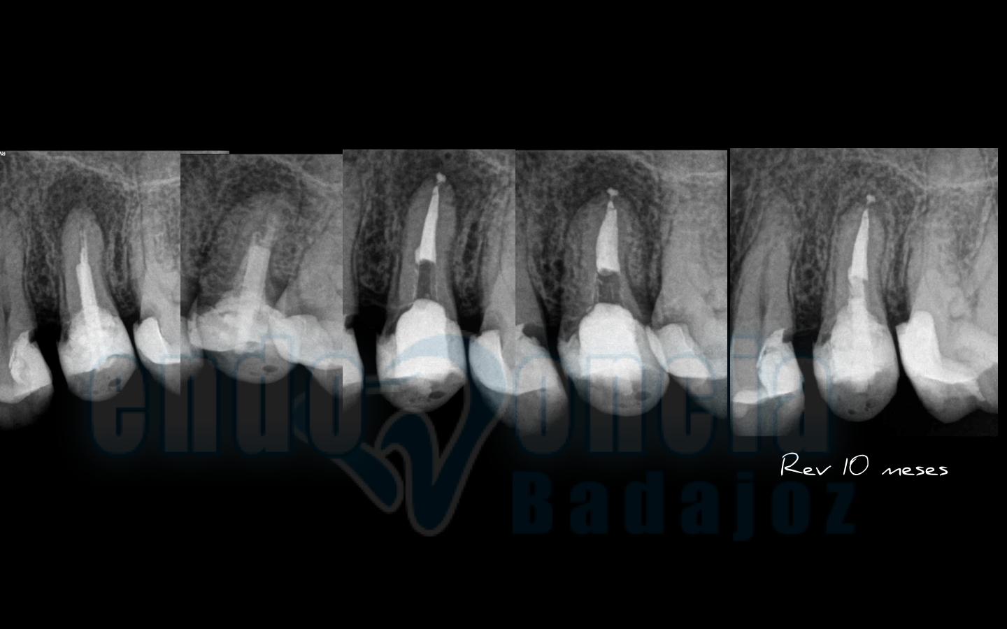 Premolar superior, con un tratamiento endodóntico con perno y suboturación que presentaba una lesión apical. Retratamos la pieza y vemos como a los 10 meses existe una buena regeneración apical.