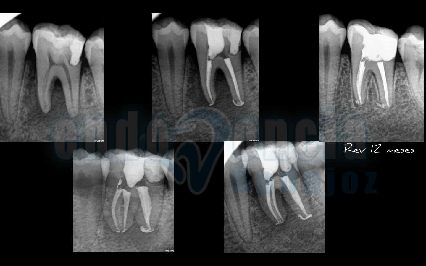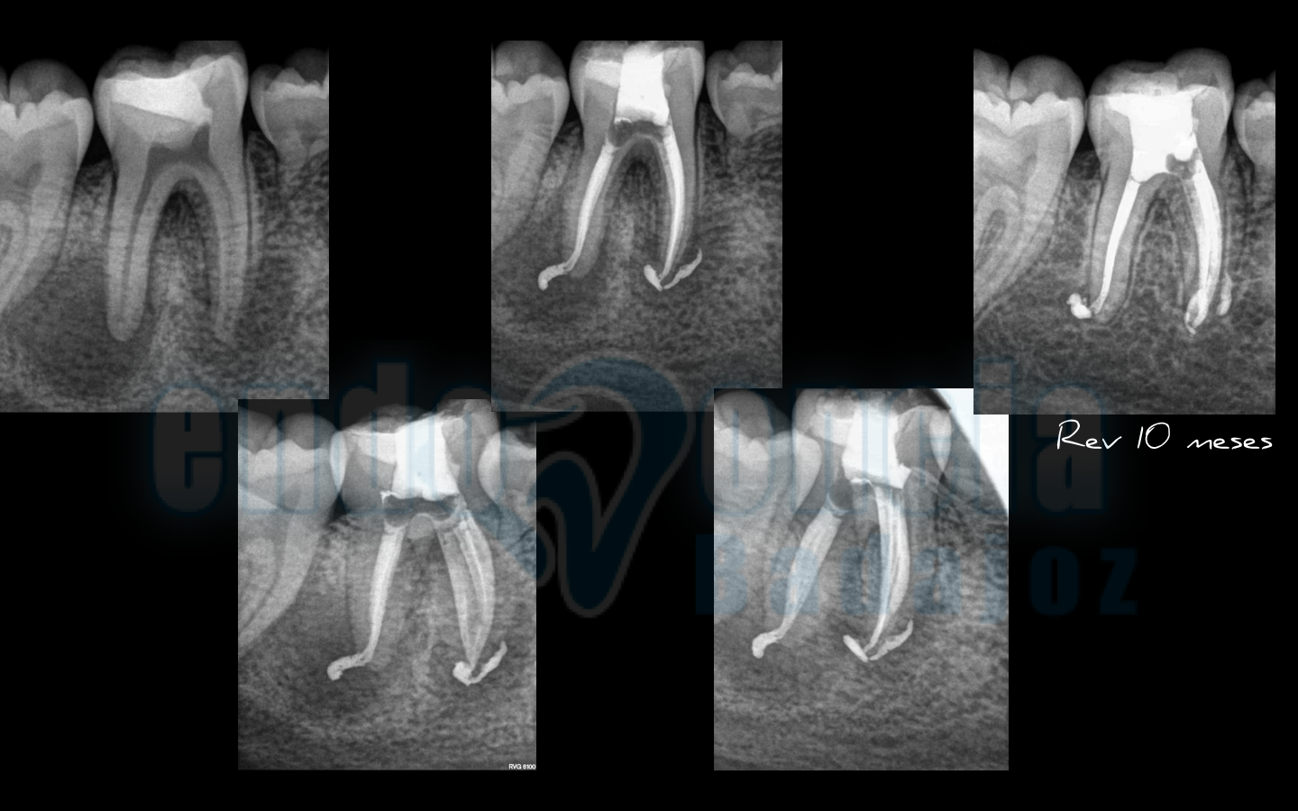 Molar inferior , con una Periodontitis Apical Asintomática, con gran lesión apical, que vemos que manejando la anatomía interna y haciendo un buen tratamiento, a los 10 meses vemos una gran regeneración de la lesión.