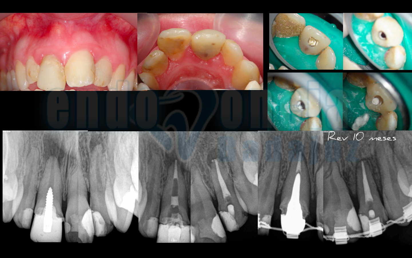 Sector anterosuperior, tratamiento de un incisivo central con perno de aleación de oro, que decidimos eliminar para tratar el conducto y sellarlo con MTA y un I. lateral , ambos con lesiones apical que a los 10 meses vemos con perfecto estado de salud apical.