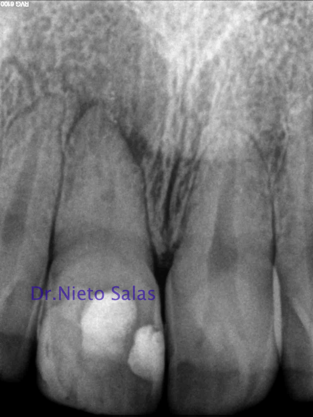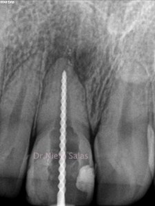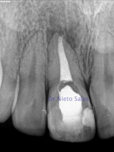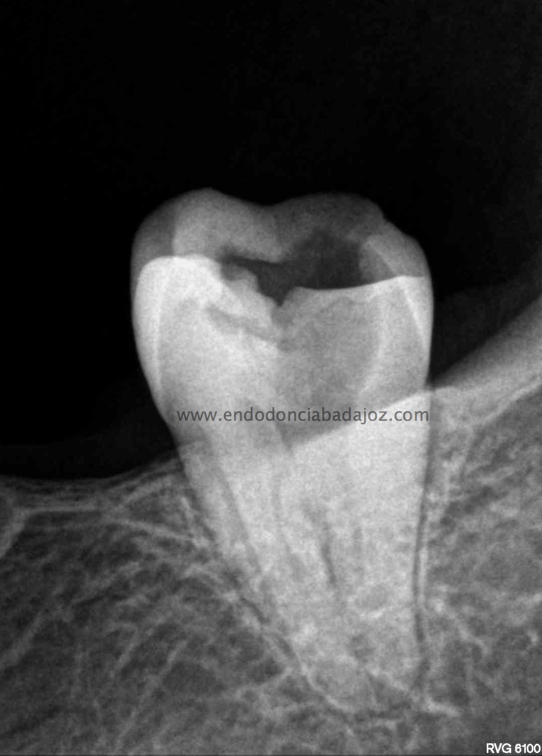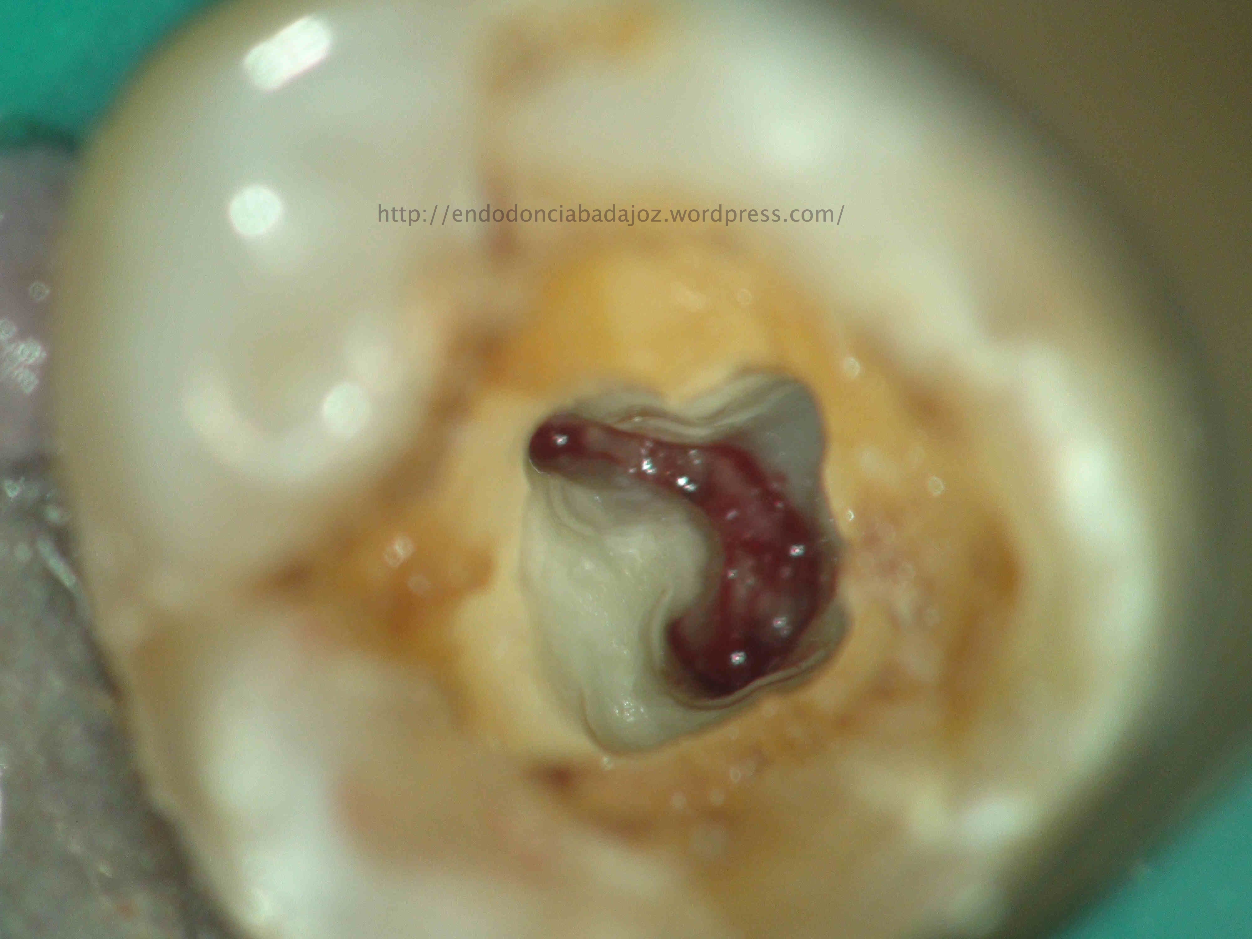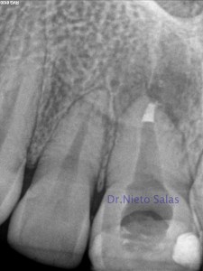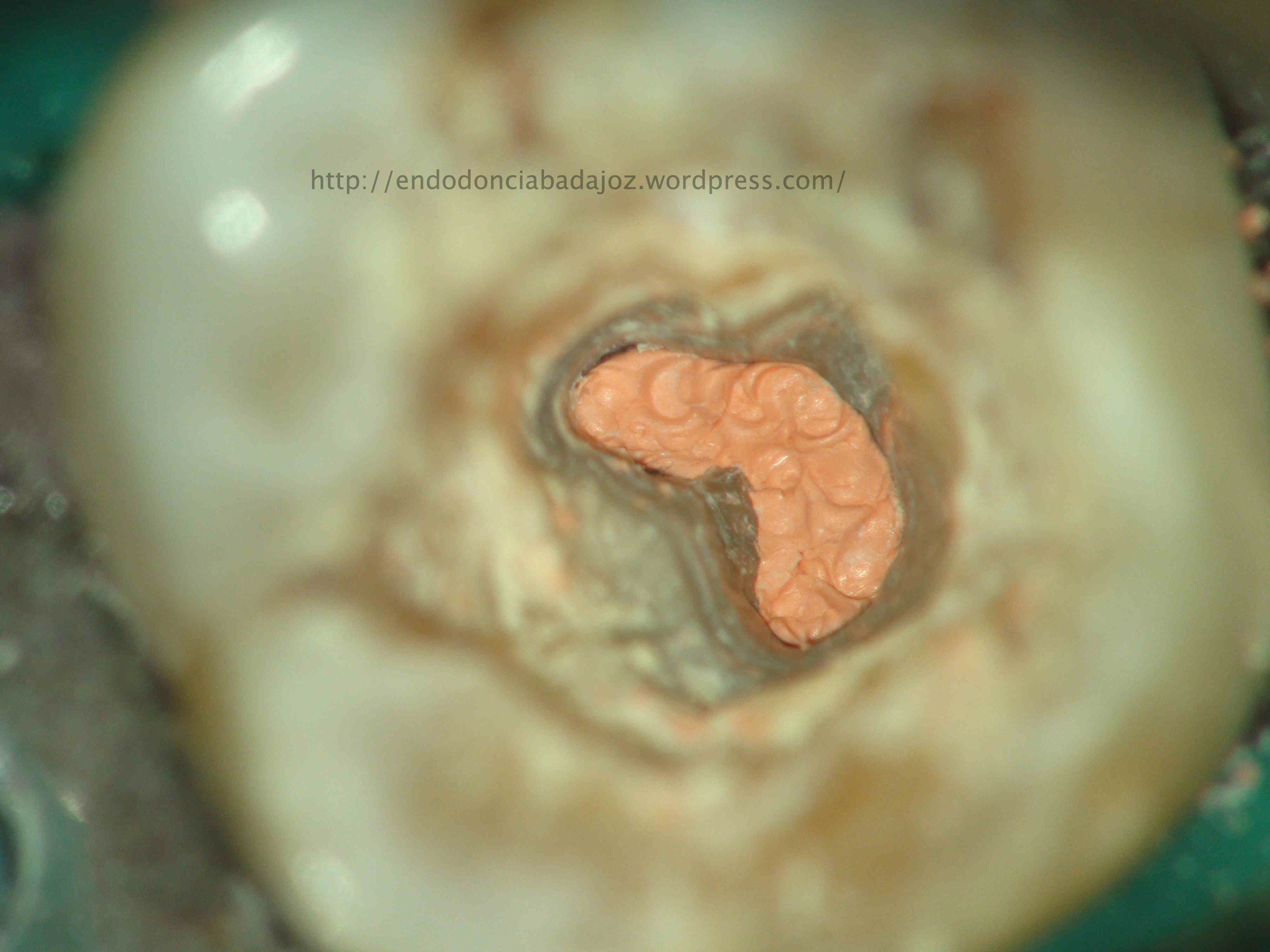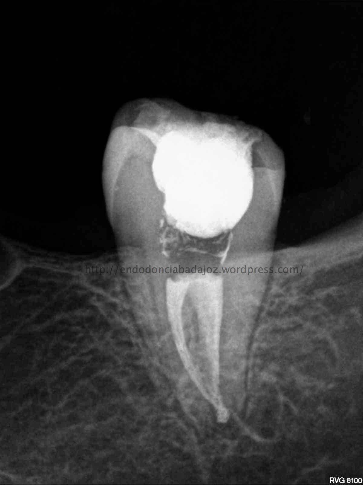 Realizamos el tratatamiento de conductos con la sospecha del causante de la necrosis es una fractura vertical, pero no hemos podido ver la linea de fisura.