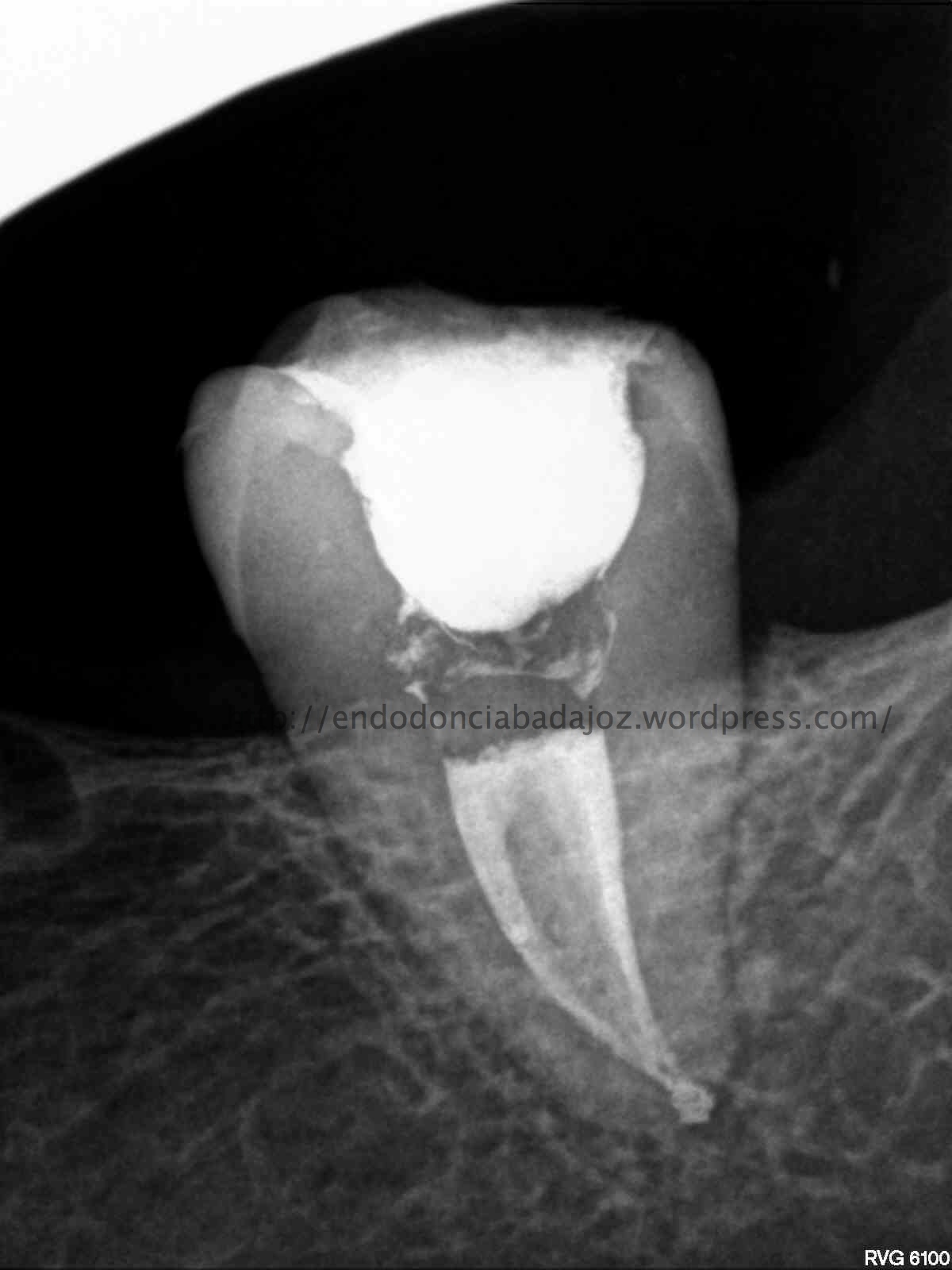 Con un aparente, buen tratamiento de conductos, estaría indicado una cirugía endodontica frente a este fracaso endodóntico por vía ortógrada, ya que necesitaríamos la ayuda de una obturación retrógrada.