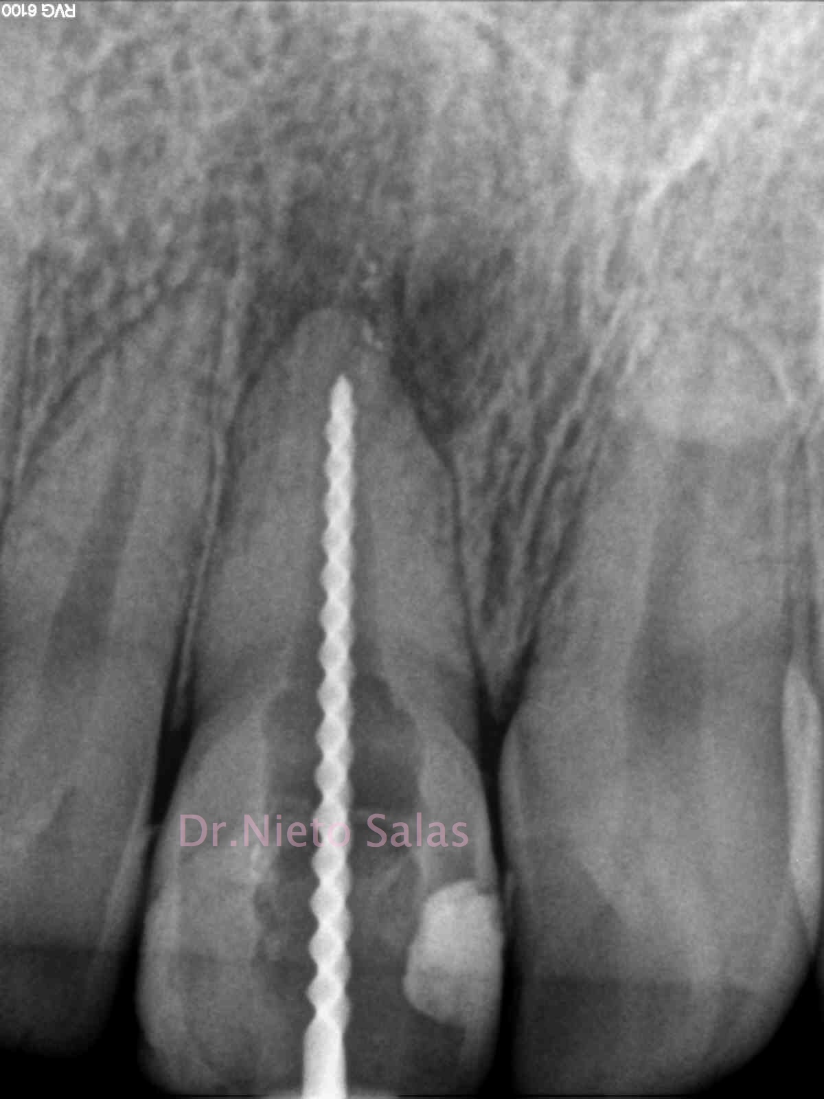 Después de realizarle un tratamiento de conductos a la pieza 2.1 que presentaba una periodontitis apical crónica que fístulizaba, el paciente nos llegó los 4 meses con una nueva presencia de la fístula.